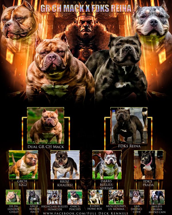 Full Deck Kennels is always looking for what's next and in front of us. With that being said we have matched up our production, FDK's Reina De Corazones with the King of Hearts himself, Dual Gr Champion Mack. Reina's amazing structure is enough to put some males to shame but adding Gr Ch Mack's mass along with his structure as well these pups will be SHOW STOPPERS. Get on that waiting list NOW!